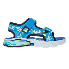 Block-to-block style and sunny-weather comfort pair up in Skechers Mega-Splash 4K. This thematic Mega-Craft® sandal features a synthetic strap upper, Skechers Adaptive Closure, and a fun tech-piece midsole.