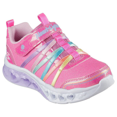 Description: Brighten your steps with heart-filled style wearing Skechers S-Lights® Flutter Heart Lights® - Rainbow Bestie. This light-up fashion sneaker features a synthetic and sparkle mesh upper with rainbow satin...