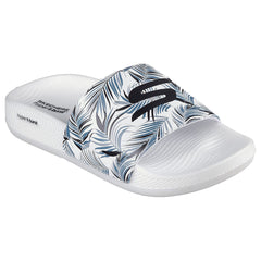 Post-run recovery gets upgraded with more comfort and athletic style in the Skechers Hyper Slide - Tropic Vibe sandal. Features a smooth synthetic upper with tropical print details, HYPER BURST cushioned midsole and Goodyear performance outsole.