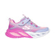 Light up the playground wearing Skechers S-Lights®: Cosmic Glow. This light-up active design features an ombre sparkle mesh and synthetic upper with stretch laces, an adjustable instep strap, and a well-cushioned midsole with step-activated lights.