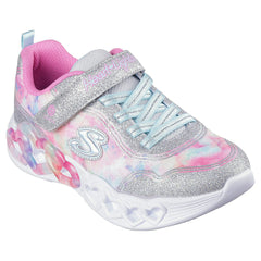 Sparkle and shine in the Skechers Heart Lights®: Infinite Heart Lights - Color Lovin'. This light-up sneaker features a woven cloud print fabric upper with synthetic glitter overlays and a sculpted light-up midsole with heart-shaped details.