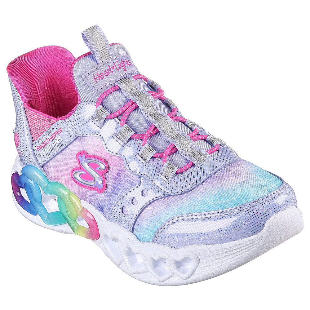 Sparkle and shine in magical delight wearing Skechers Hands Free Slip-ins® Heart Lights®: Infinite Heart Lights. This Slip-ins® light-up design features our exclusive Heel Pillow™, a heart print ombre mesh upper with synthetic glitter overlays, fixed stretch laces, and a sculpted light up midsole with 'heart chain' detail.