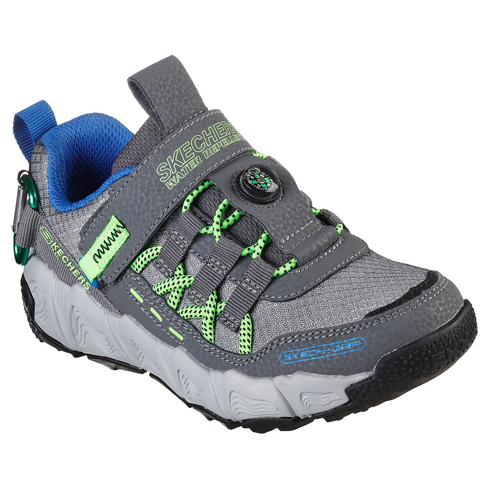 Adventure in all-terrain comfort with Skechers Velocitrek - Pro Scout. This hiking trail sneaker features a water-repellent synthetic and mesh upper with an attached compass, carabiner, stretch laces and an instep strap.