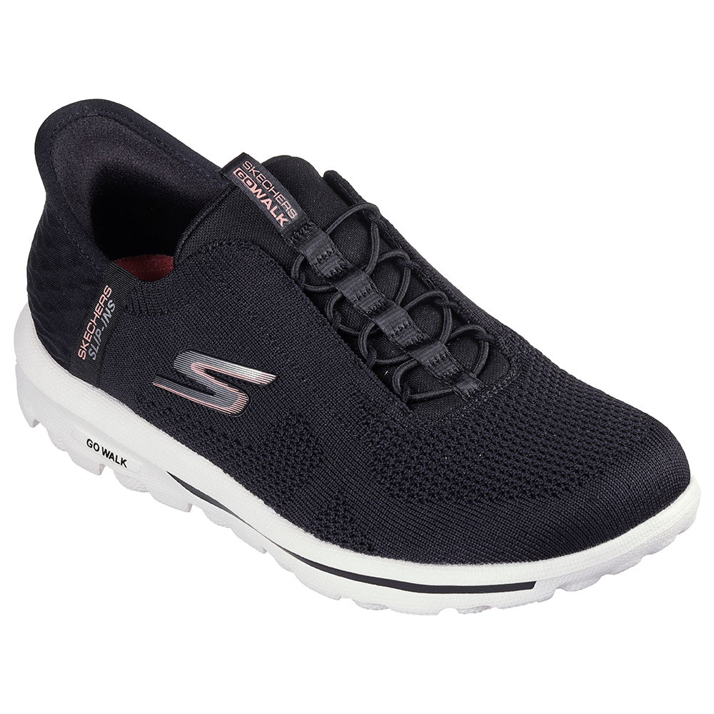 Step-in to convenient walking comfort and cushioning wearing Skechers Hands Free Slip-ins®: GO WALK® Travel - Milan. Designed with our exclusive Heel Pillow™, this sleek style features an engineered knit upper with stretch laces, Skechers Air-Cooled Memory Foam® insole, and a lightweight 5GEN® cushioned midsole.