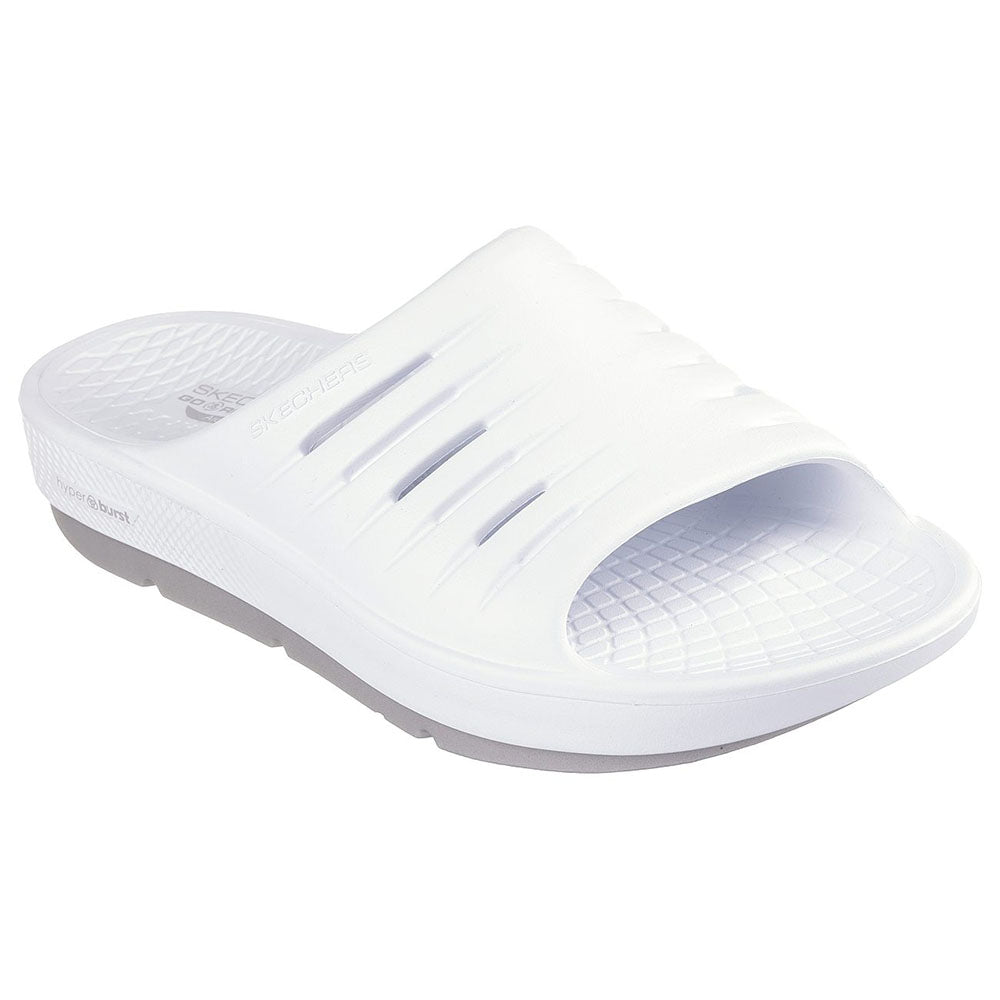 Relax in specialized comfort and style wearing Skechers GO RECOVER® Refresh. This athletic recovery slide sandal features a synthetic upper with linear perforations and premium HYPER BURST® foam with Arch Fit® support that redistributes pressure for impact reduction.