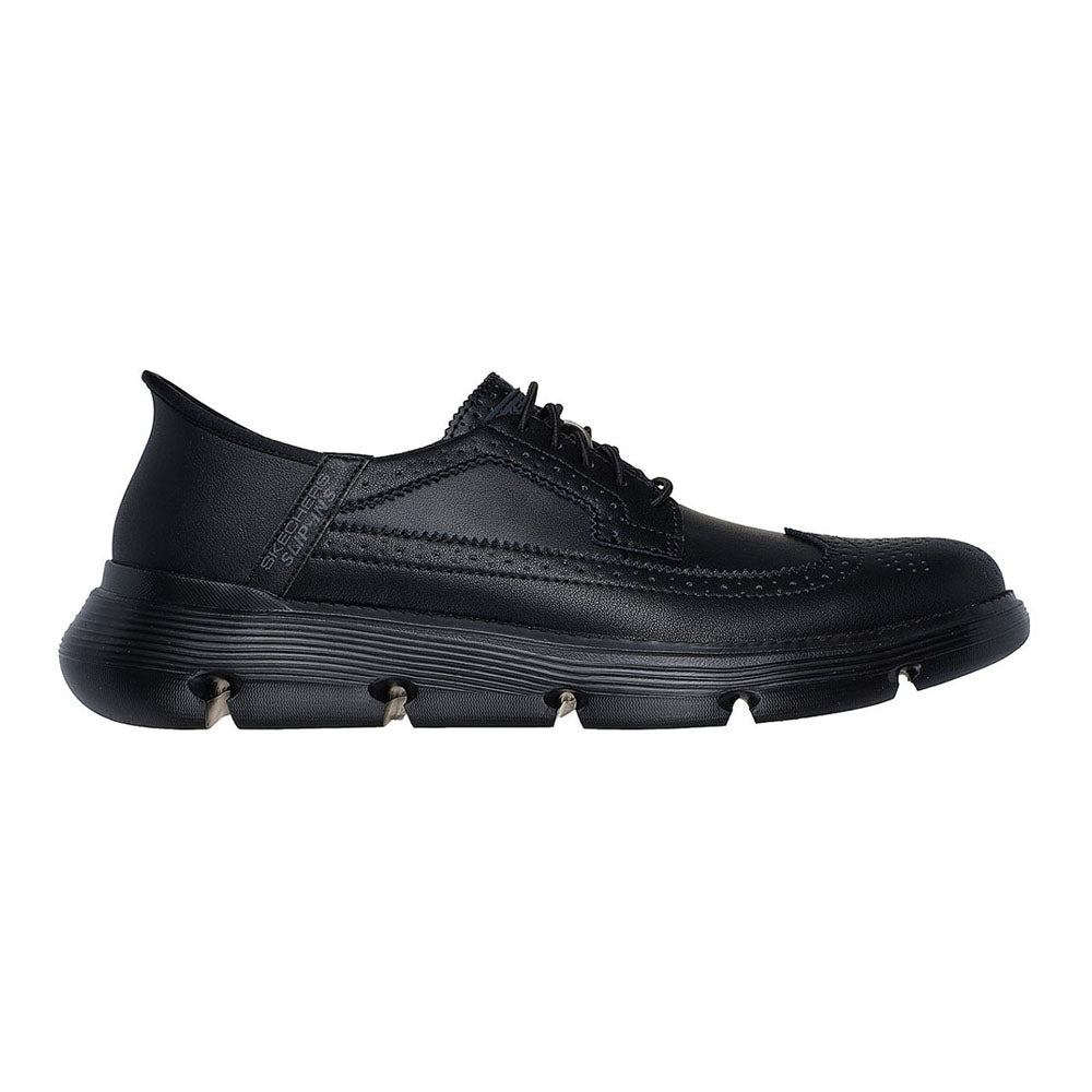 Dress to the nines with effortless comfort wearing Skechers Hands Free Slip-ins®: Garza - Rubio. Designed with our exclusive Heel Pillow™, this wing tip Oxford slip-on features a leather upper with stretch laces, a charcoal-infused Skechers Air-Cooled Memory Foam® insole, and Memory Arch™ for added support.