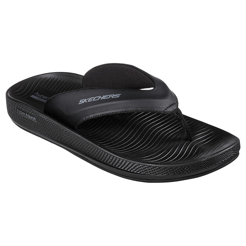 Post-run recovery gets upgraded with more comfort and athletic style in Skechers Hyper Slide - Simplex. This thong sandal features a synthetic upper with HYPER BURST® cushioning and a Goodyear® Rubber Outsole.