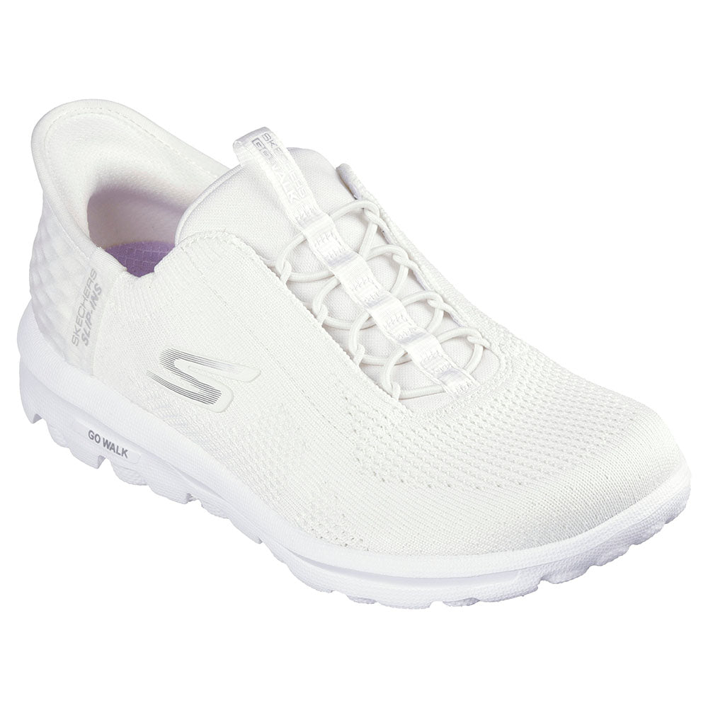 Step-in to convenient walking comfort and cushioning wearing Skechers Hands Free Slip-ins®: GO WALK® Travel - Milan. Designed with our exclusive Heel Pillow™, this sleek style features an engineered knit upper with stretch laces, Skechers Air-Cooled Memory Foam® insole, and a lightweight 5GEN® cushioned midsole.